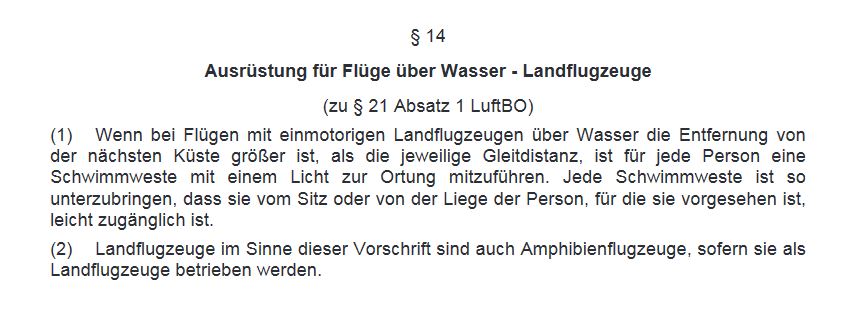 Hier noch zum Verständnis ein Ausschnitt aus der die Durchführungsverordnung zur LuftBO, NFL II 39/09 zur Ausrüstung von Landflugzeugen bei Flügen über Wasser.