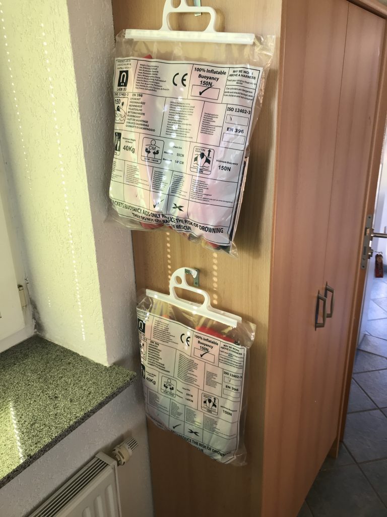 Die vier Rettungswesten sind einzeln je in einem Aufbewahrungsbeutel verpackt und im Büro unter dem Tower gelagert (siehe Foto am Schluß). Vor dem jeweiligen Flug sollte jede Rettungsweste auf Vollständigkeit geprüft werden. Bitte nach der Nutzung die Rettungsweste wieder in gleicher Weise einlagern.